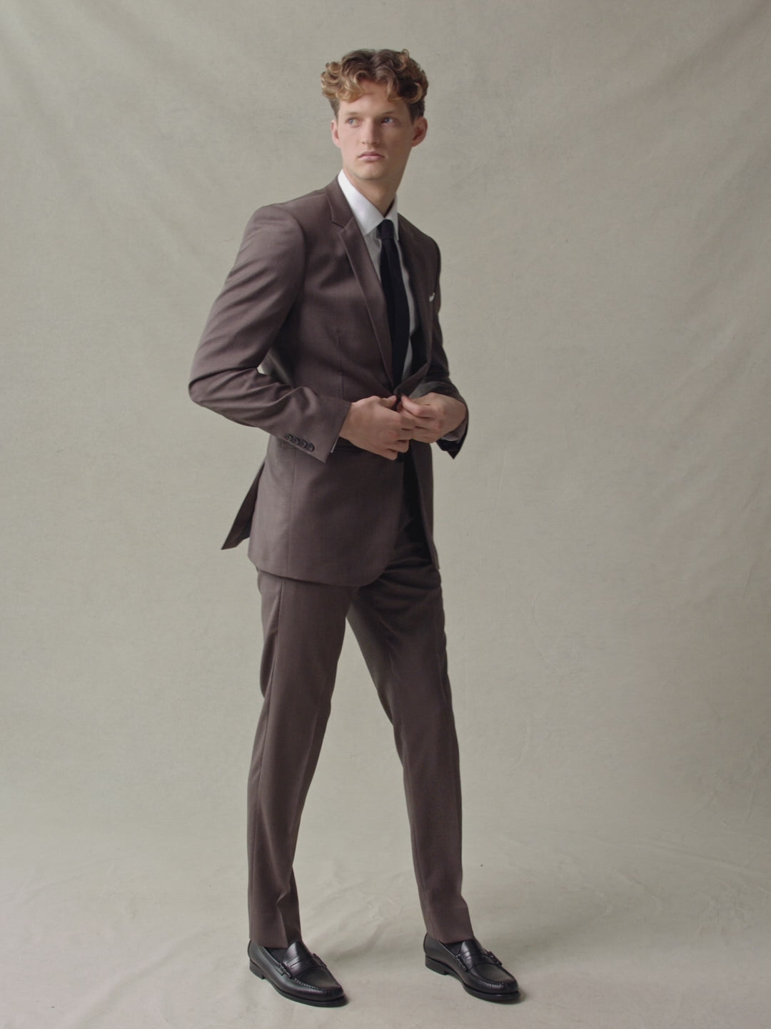 A timeless brown merino wool suit jacket with a notch lapel and double button closure.