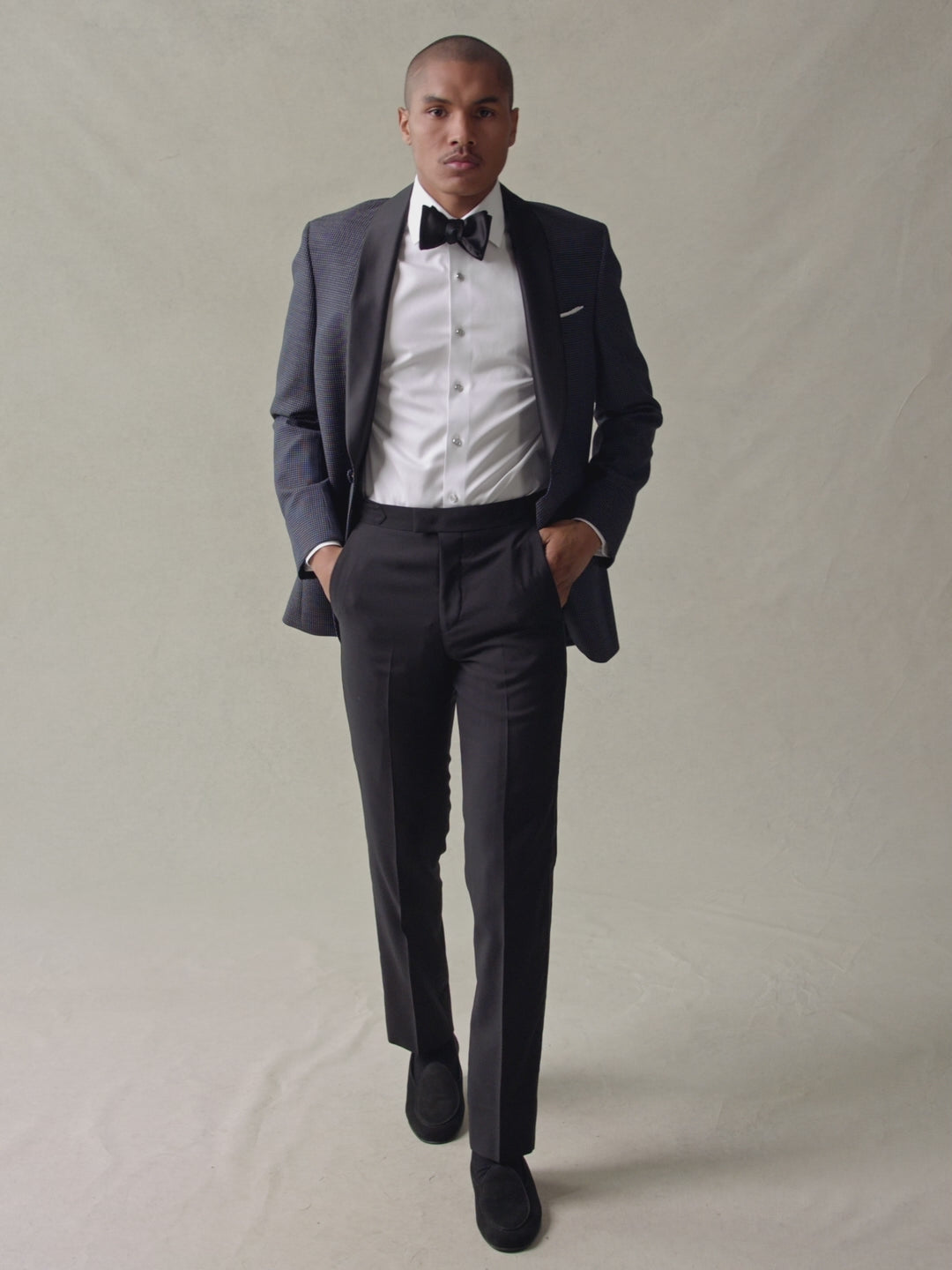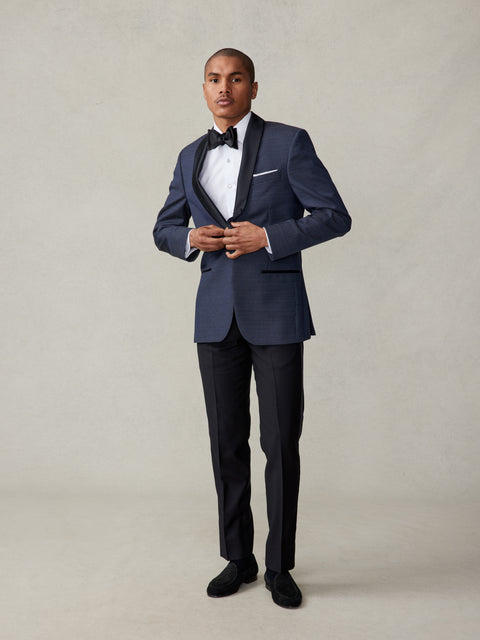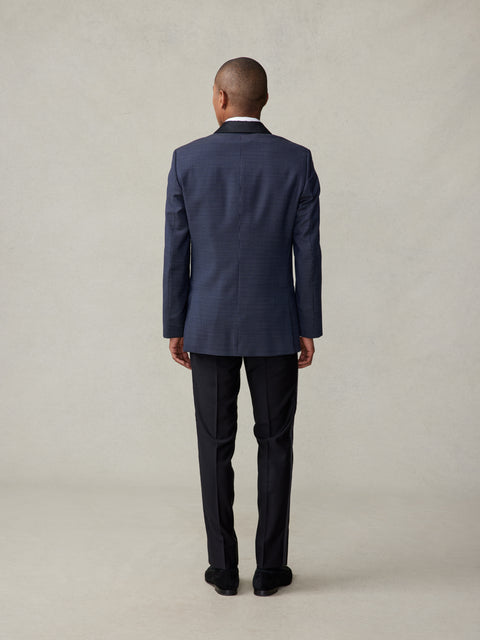 A polished navy pin dot tuxedo jacket featuring a black silk shawl collar with silk trimmed pockets and single button closure.