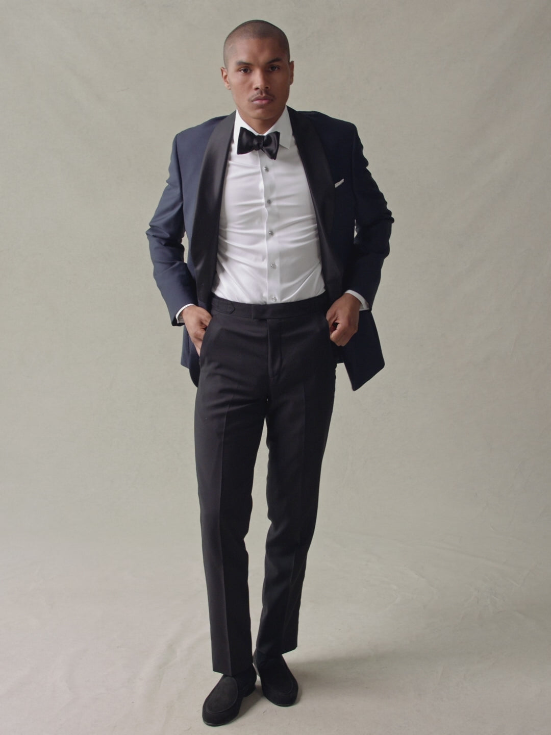 A navy tuxedo jacket featuring a streamlined black silk shawl collar with a silk trimmed breast pocket and single button closure.