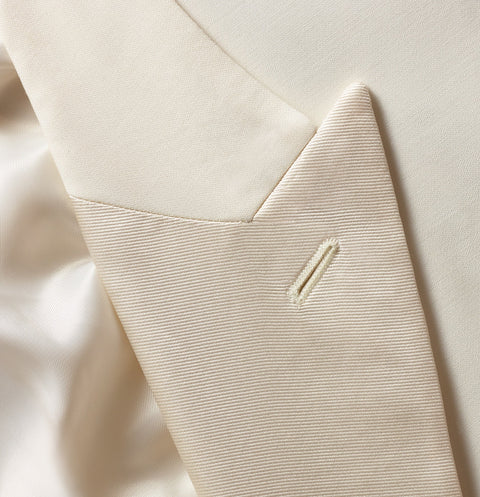 A refined tuxedo jacket featuring ivory white silk peak lapels, silk trimmed pockets and a single button closure.