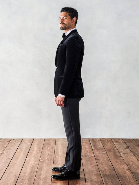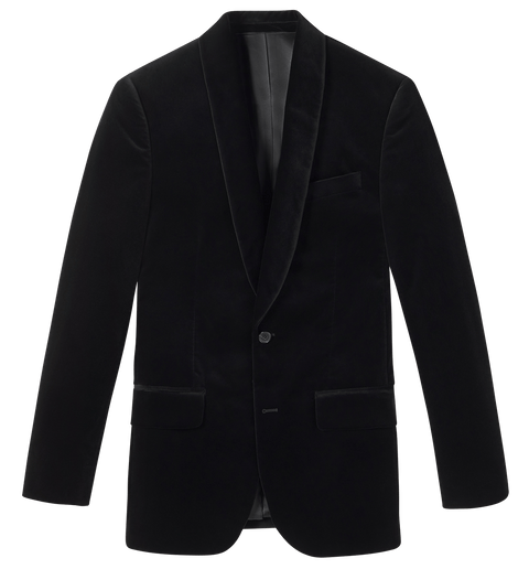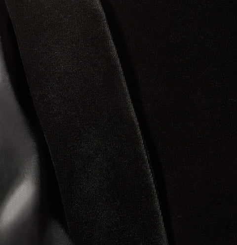An elegant black velvet jacket featuring a shawl collar and single button closure.