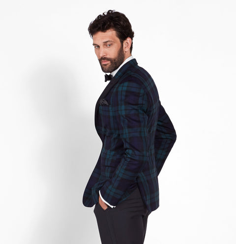 A black watch tartan tuxedo jacket featuring black satin peak lapels and a single button closure.
