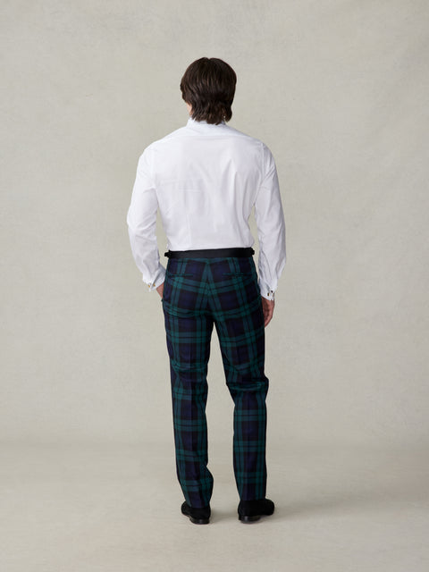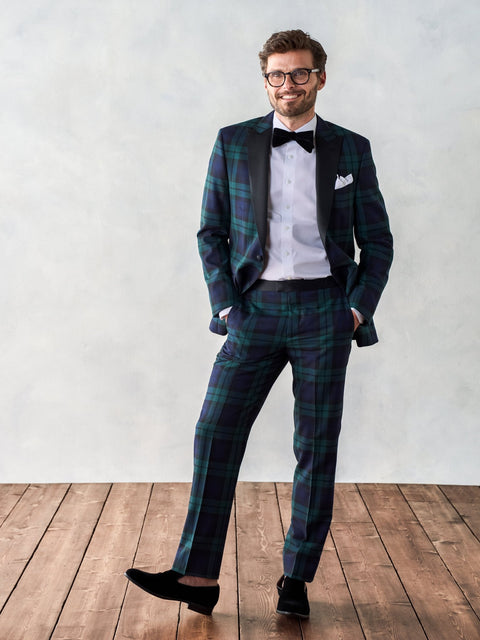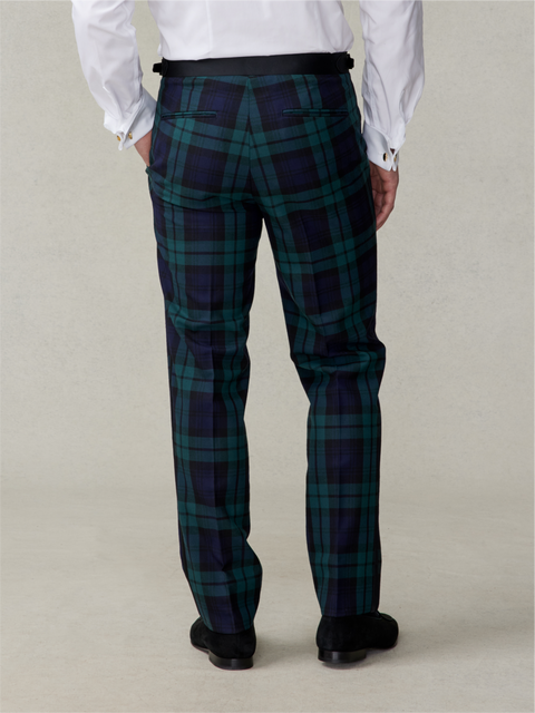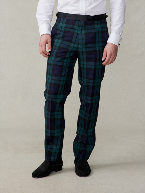 Black watch tartan tuxedo pants with an option of a slim or classic fit.