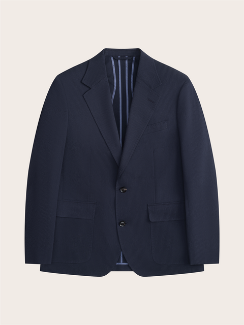 A navy cotton blend seersucker suit jacket with notch lapels, patch pockets, a double button closure, and subtle stretch.